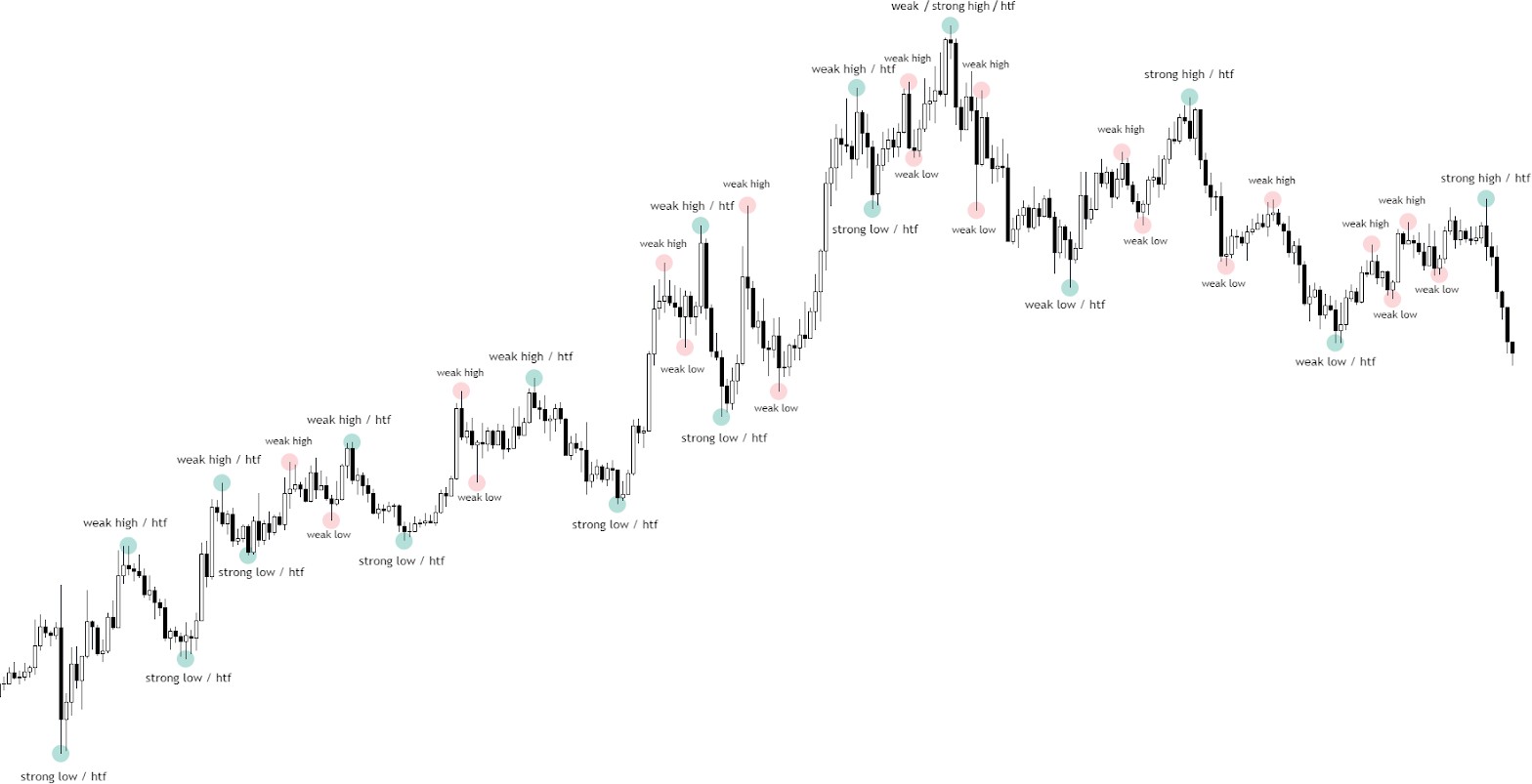 Ключевые структурные точки (свинги) разделяют на **Strong High / Strong Low И Weak High**
